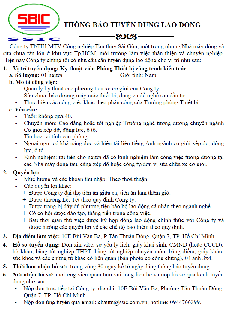 Thông báo tuyển dụng kỹ thuật viên Cơ giới xếp dỡ, động lực, ô tô