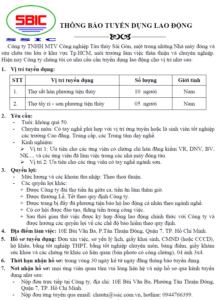 Thông báo tuyển dụng thợ sắt hàn, tẩy rỉ-sơn